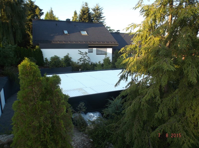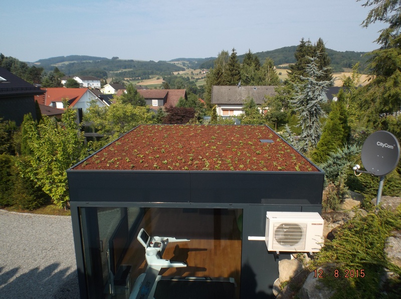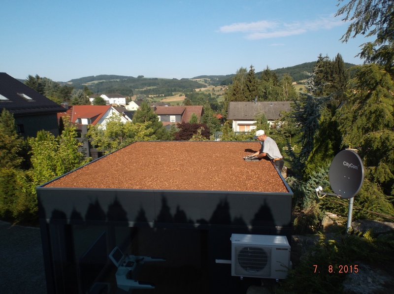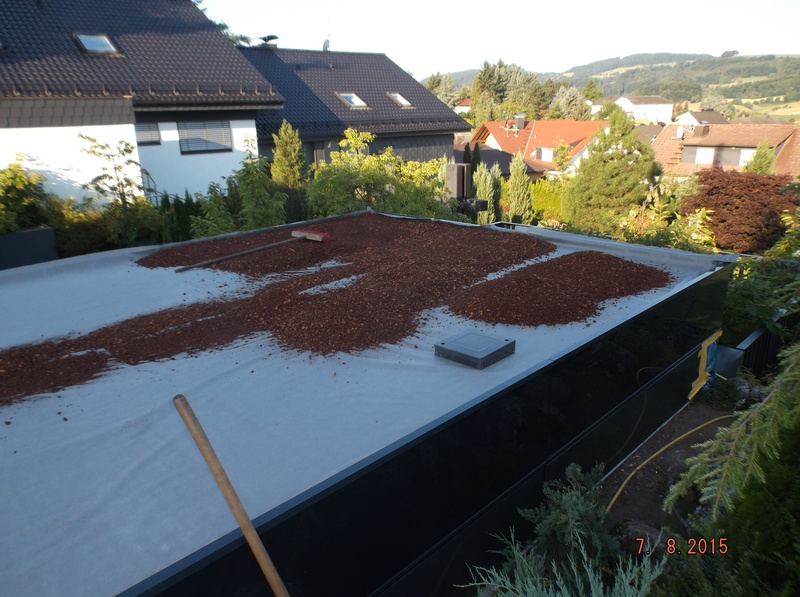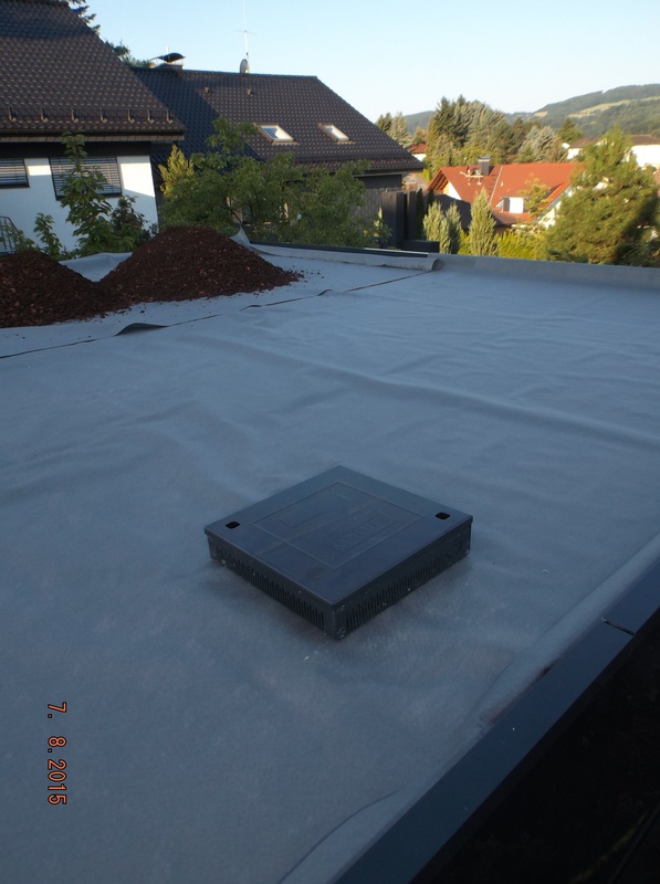 EPDM Folie 1,5mm, wurzelfest, Speicherschutzmatt, Trainagematte, Filtervlies, Dachgartenerde (Steinrosenflor), Begrünung mit Gründachstauden.