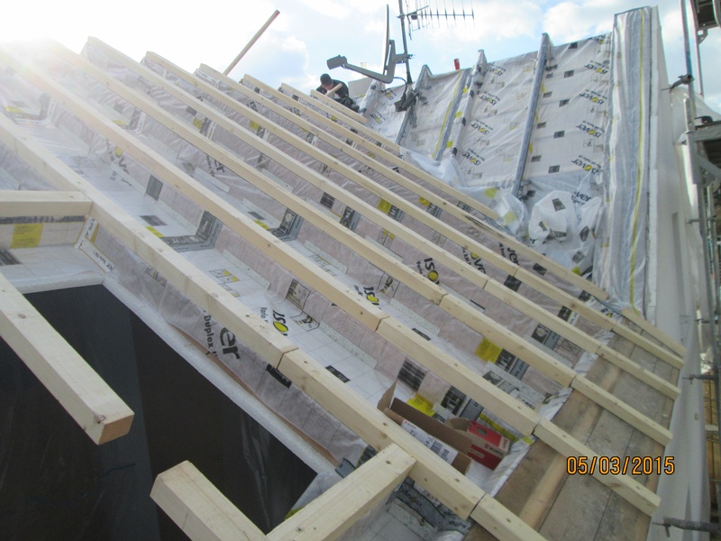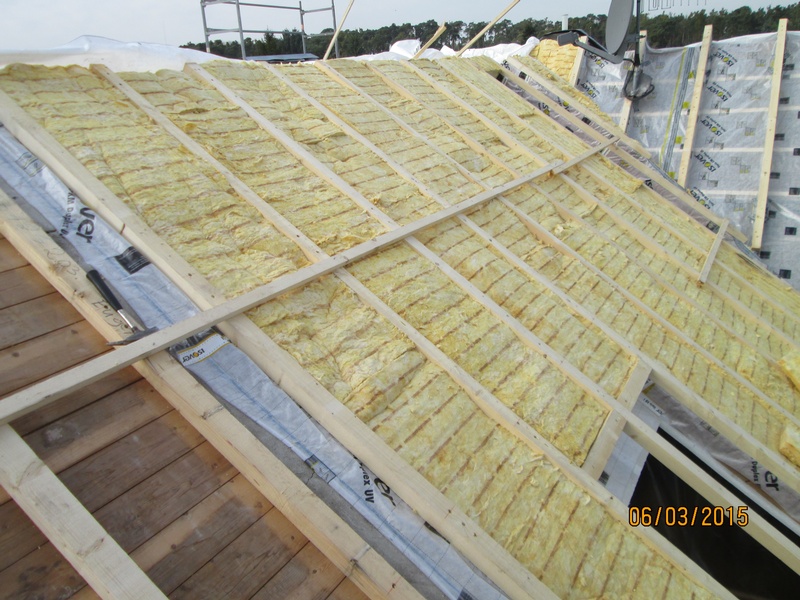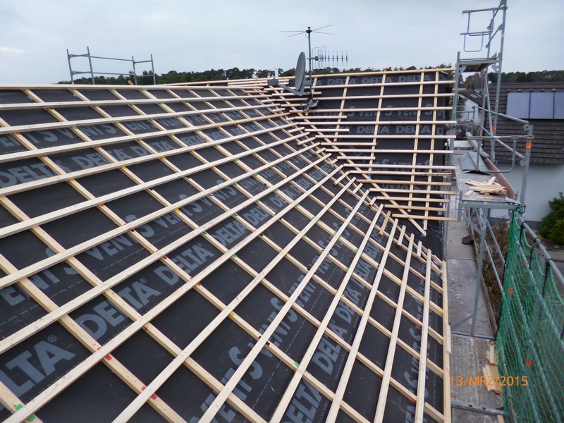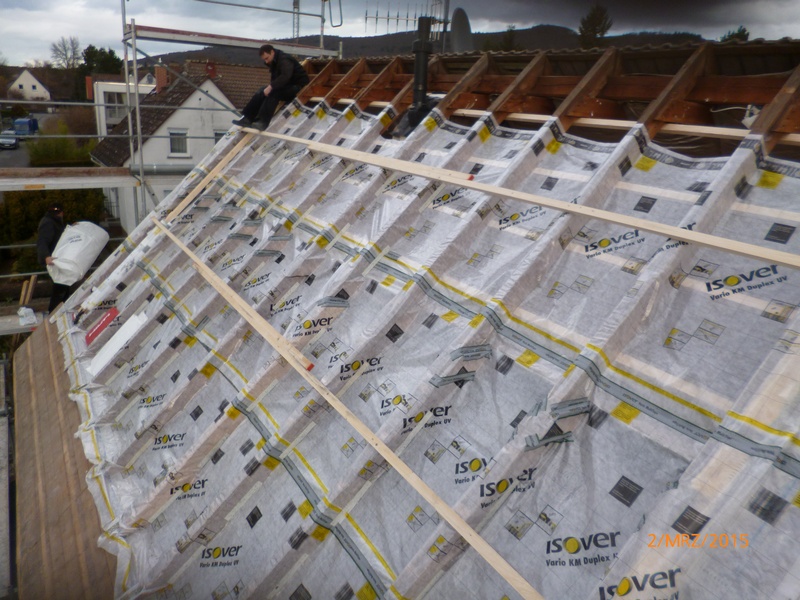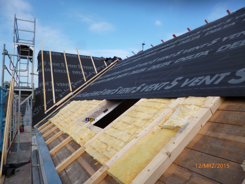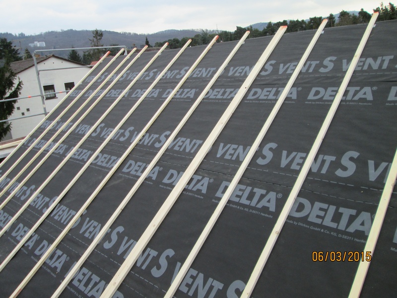 Diffusionsoffene Unterspannbahn der Firma Dörken. Dacheindeckung mit Tonziegel V11 der Firma BRAAS.