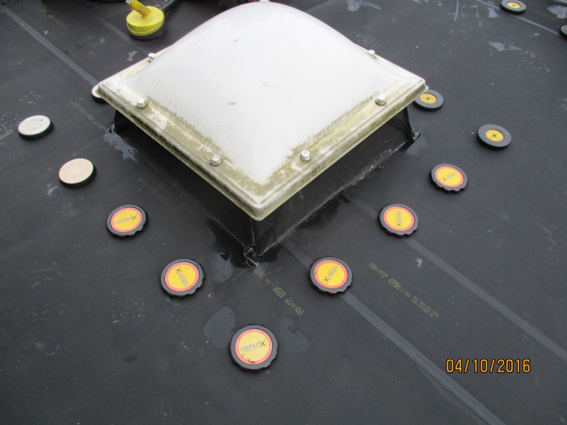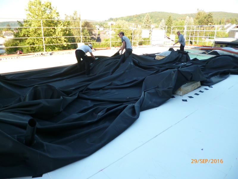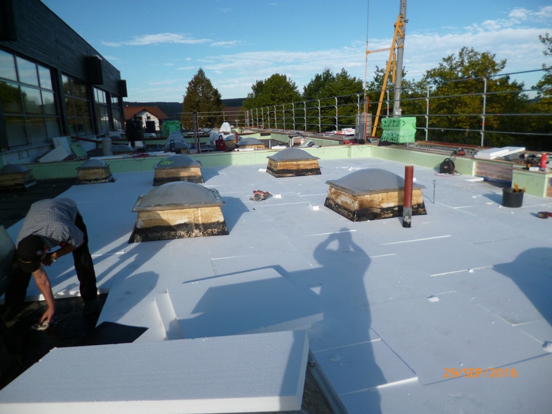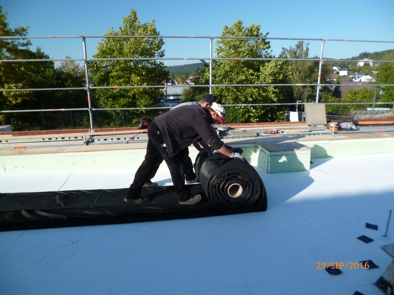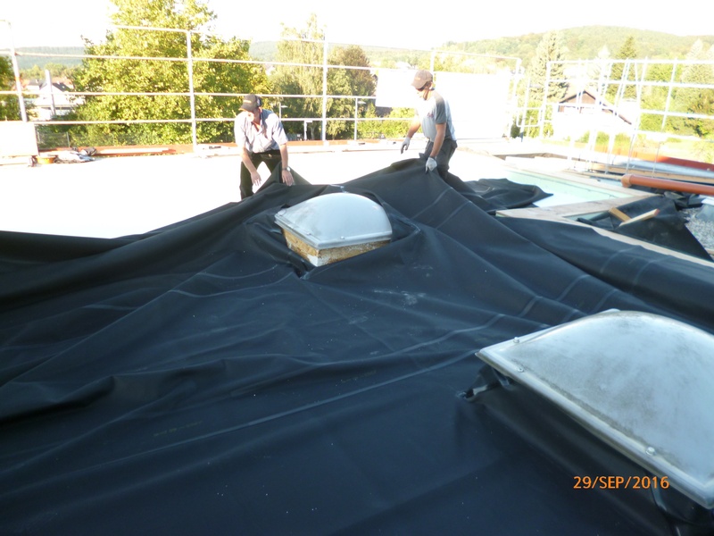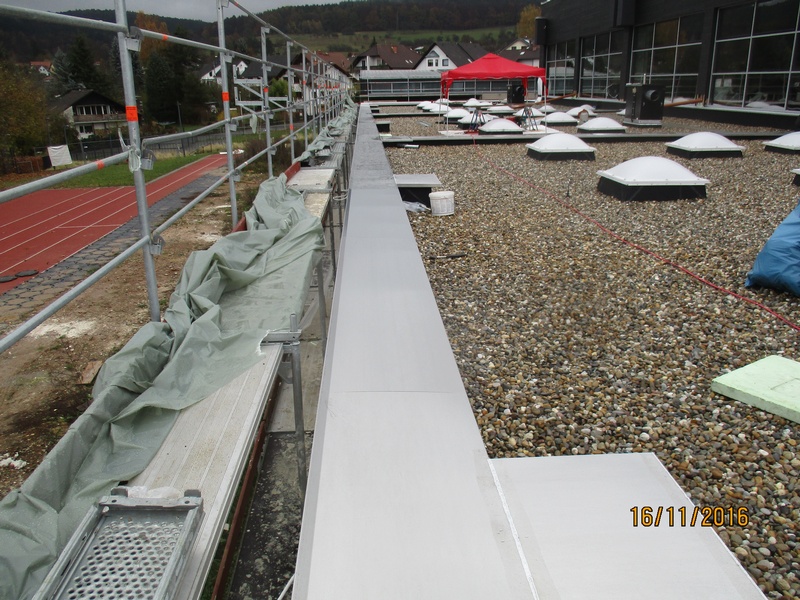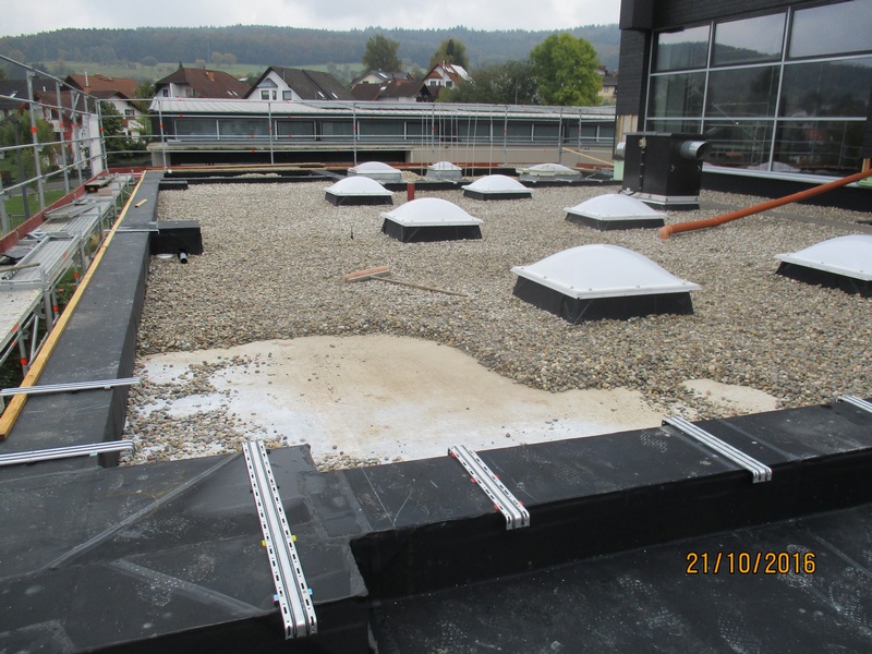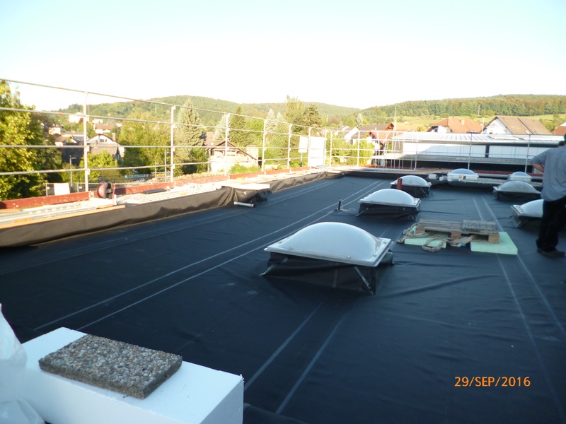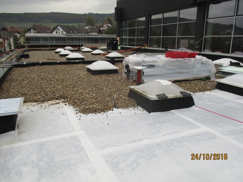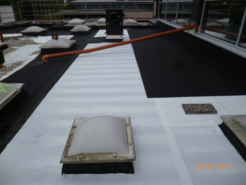 Komplettsanierung mit Bitumen Dampfsperre, EPS Gefälledämmung, EPDM Flachdachfolie einschließlich mechanischer Befestigung im Rand- und Lichtkuppelbereich, Auflast durch Schutzvlies und Kies. Mauer- und Atikaabdeckung aus Aluminium.